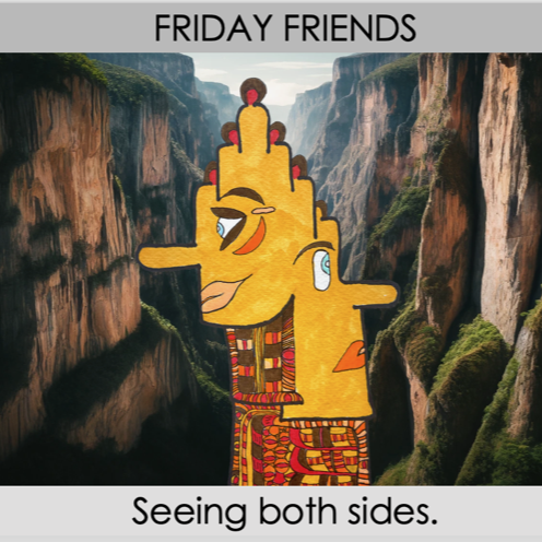 Friday Friends began during the pandemic. Each week a conversation between pen and ink doodles takes place over a recent photographed background. Sometimes AI images have found their way into the conversation. 😊