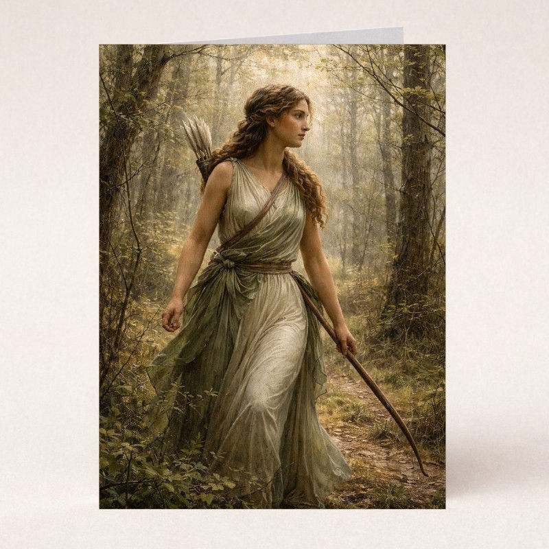 This Spring Artemis art print portrays the goddess of the wild walking through a luminous forest, bow in hand, grounded and self-assured. The composition blends softness and strength, earthy greens, diffused golden light, and flowing fabric that feels alive with movement.
